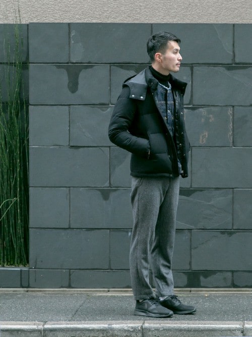 ダウンにデニムだとどうしてもカジュアルになり過ぎますのでウールパンツを合わせる事でカジュアル過ぎないスタイルを出す事ができます!