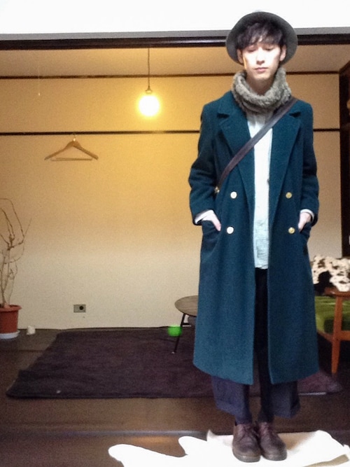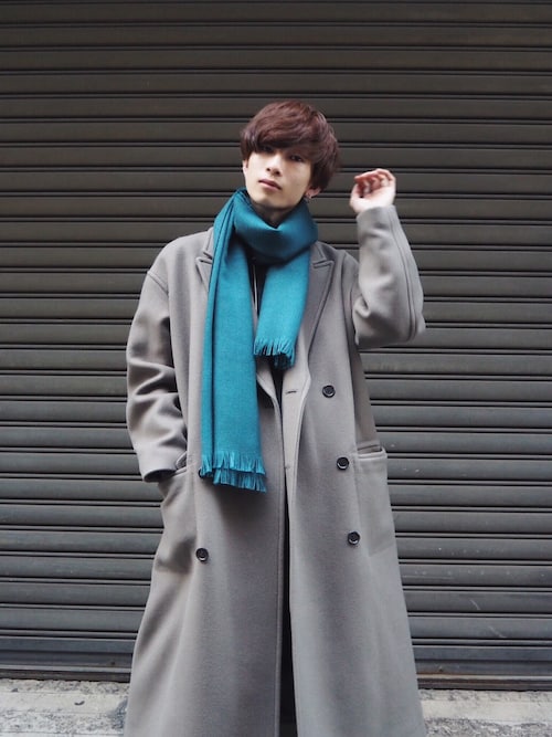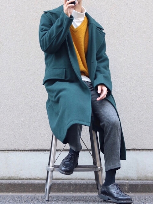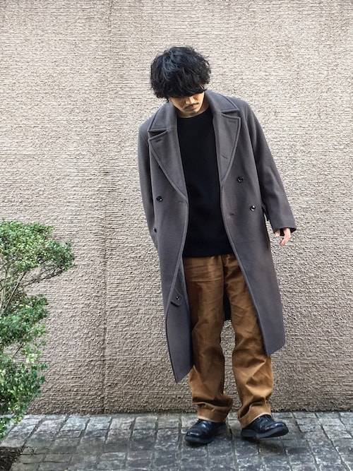 他色のダブルチェスターコート着こなし