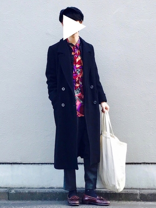 柄シャツが遊び心を出してますが黒のダブルチェスターコートがしっかりと落ち着き感を出してますね!