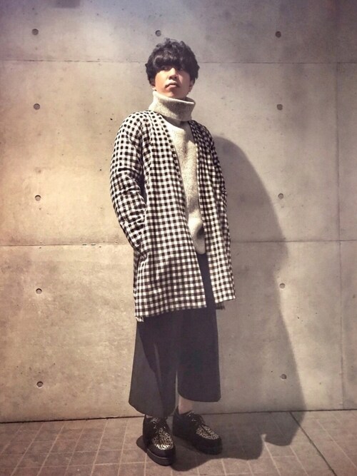 大きなタートルネックが特徴的!首元を大きく見せる事とゆるく着る事でお腹のお肉をカバーしやすい!?体格がガッシリしている方でも目立たず着こなす事が出来ます!また首元のタートルネックはそれだけで暖かさアップです!